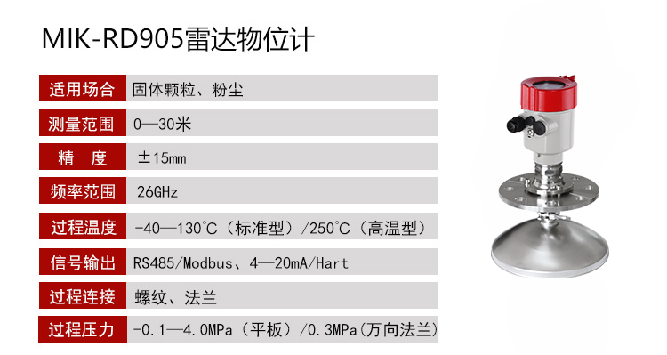 MIK-RD903/905雷达物位计天线发射极窄的微波脉冲,这个脉冲以光速在空间传播,遇到被测介质表面,其部分能量被反射回来,被同一天线接收。发射脉神与接收脉冲的时间间隔与天线到被测介质表面的距离成正比。由于电磁波的传播速度极高,发射脉神与接收脉神的时间间隔很小(纳秒量级)很难确认,MIK—RD903/905高频雷达物位计采用种特殊的解调技术,可以准确识别发射脉神与接收脉神的时间间隔,从而进一步计算出天线到被测质表面的距离。