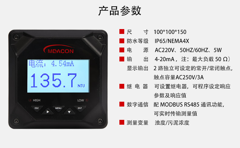 MIK-PTU100在线浊度分析仪内置微处理器,适用于于污水厂、自来水厂、水站、地表水、工业等领域浊度监测,例如:污水厂沉淀池、曝气池、氧化沟、提升泵站的浊度测量。本浊度/污泥浓度控制器是一款智能在线化学分析仪器,广泛应用于火电、化工化肥、冶金、环保、制药、生化、食品和自来水等各个行业。 MIK-PTU100浊度/污泥浓度传感器的原理基于组合红外吸收散射光线法,应用国际浊度测定标准ISO7027方法可以连续并精确地测定浊度或污泥浓度。