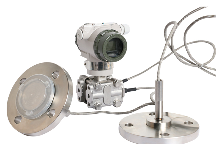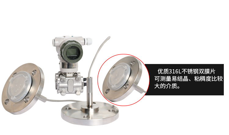 美控MIK-3051DP双法兰液位变送器产品利用差动电容检测原理,当两侧压力不一致时,致使容室中测量膜片产生位移,其位移量与压力差成正比,通过电路处理将电容变化量转换成4~20mA的二线制电流信号输送给二次仪表显示液位值,同时也可以表头显示液位值。该液位变送器具有坚固抗振、量程、零点和阻尼现场连续可调。