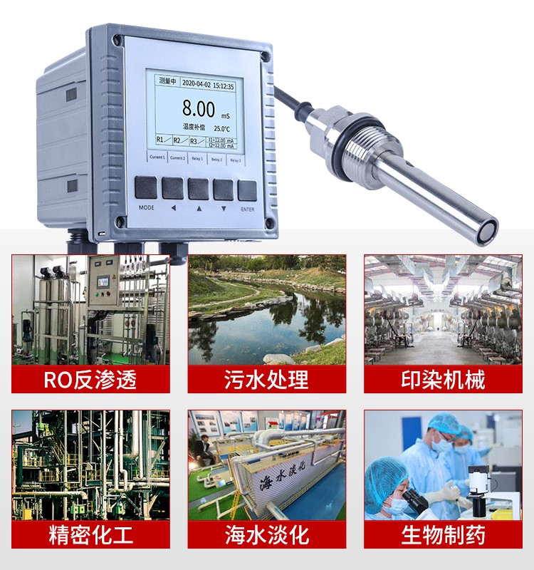 MIK-EC8.0型工业电导率仪表,可对各种工业用水的电导率(TDS)值进行连续测量和控制,本装置广泛应用于科学实验装备、化工、制药、环保、冶金、造纸、食品、饮料及供水等行业。