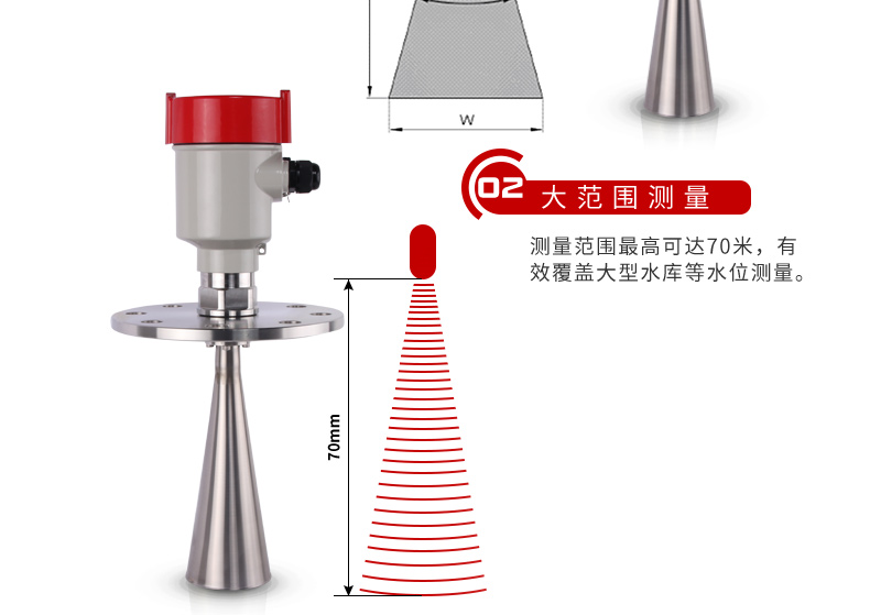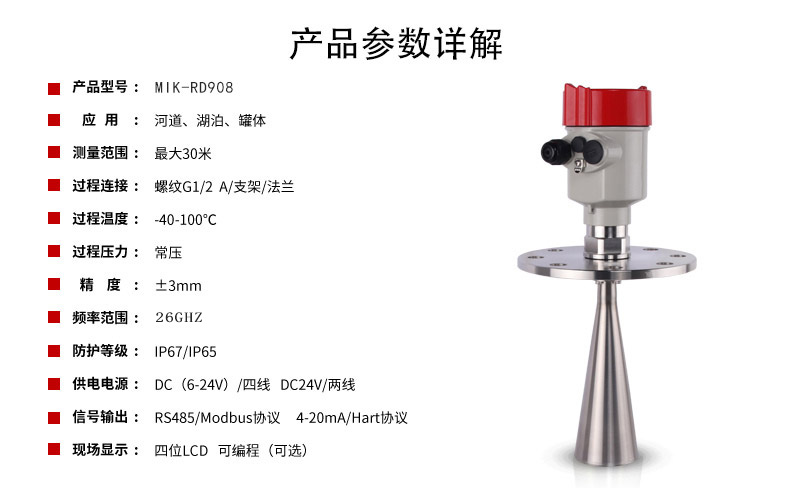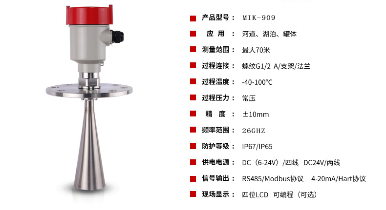 MIK-RD908/909雷达液位计天线发射极窄的微波脉冲,这个脉冲以光速在空间传播,遇到被测介质表面,其部分能量被反射回来,被同一天线接收。发射脉冲与接收脉冲的时间间隔与天线到被测介质表面的距离成正比。由于电磁波的传播速度极高,发射脉冲与接收脉冲的时间间隔很小(纳秒量级)很难确认,MIK系列908雷达液位计采用一种特殊的解调技术,可以准确识别发射脉冲与接收脉冲的时间间隔,从而进一步计算出天线到被测介质表面的距离。