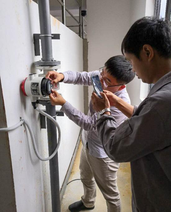 △在设备安装之前,李工为设备上电调试,以确保每台流量计在安装后可以稳定高效地运行。