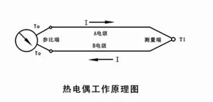 热电偶将两种不同材料的导体或半导体A和B焊接起来,构成一个闭合回路。当导体A和B的两个执着点1和2之间存在温差时,两者之间便产生电动势,因而在回路中形成一个大小的电流,这种现象称为热电效应。