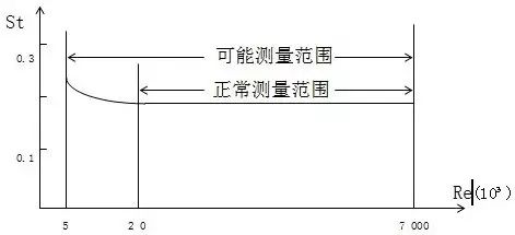 斯特罗哈数是一个无因次参数,下图表示斯特罗哈数与雷诺数的关系,在一定的雷诺数范围内,斯特罗哈数基本上保持不变,这样就可以认为雷诺数在这个范围内卡门漩涡的释放频率与流体的速度成正比。所以由检测出来的频率F就可求得流速V,并由V求得体积流量。