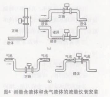 涡街流量计可安装在室内或室外。如果安装在地井里,为防止被水淹没,应选用涎水型传感器。传感器在管道上可以水平、垂直或倾斜安装,但测量液体和气体时为防止气泡和液滴的干扰,要注意安装位置(见图4)。