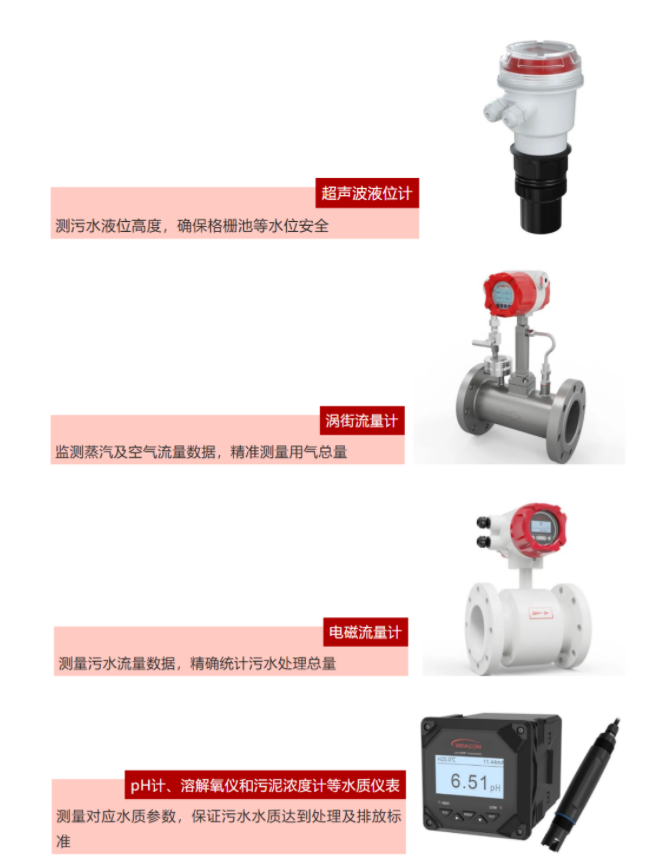 此次的现场应用工况为典型的污水处理数据监测场景,其中涉及的仪表及实现功能包括: