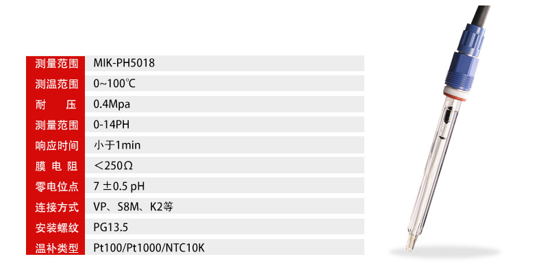 MIK-PH-5018在线高温玻璃电极适用于测试温度较高,有腐蚀性的介质。电极敏感区域大、抗机械冲击强、响应快和稳定性好。该电极能广泛用于微生物技术、制药、食品饮料、制糖,包括氯碱、采矿冶炼、造纸、纸浆、纺织品、石油化工、半导体电子工业等各种化工流程及废水处理等领域。