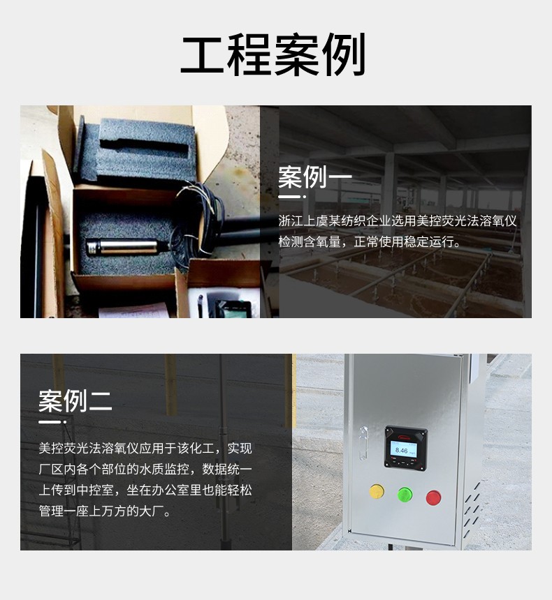 MIK-DO-7017溶解氧传感器采用荧光法测量溶解氧,传感器顶端覆盖了一层荧光 物质,当传感器发出的蓝光照射到荧光物质时,荧光物质受到激发发出红光,由于氧分子可以带走能量(猝熄效应),所以激发的红光的时间 和强度与氧分子的浓度成反比,通过计算可得出水中溶解氧的浓度。 该产品普遍应用于污水处理厂调节池、生化池、出水等各工艺过程 的 DO 在线监测;自来水厂、地表水、各种工业生产过程用水、水产养 殖等行业的 DO 在线监测。