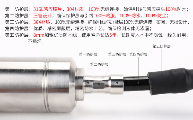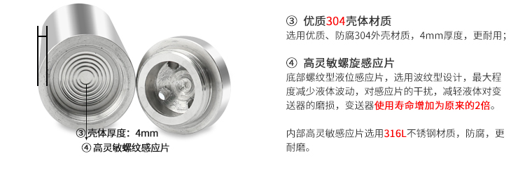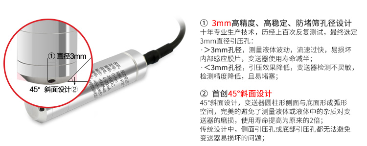 MIK-P260型硅压阻式液位压力变送器将充油芯体封装在不锈钢壳体内,前端防护帽起保护传感器膜片的作用,也能使液体流畅地接触到膜片,防水导线与外壳密封连接,通气管在电缆内与外界相连,内部结构防结露设计。MIK-P260 型内置微型信号处理电路,可进行远程传输。具有良好的稳定性和可靠性。