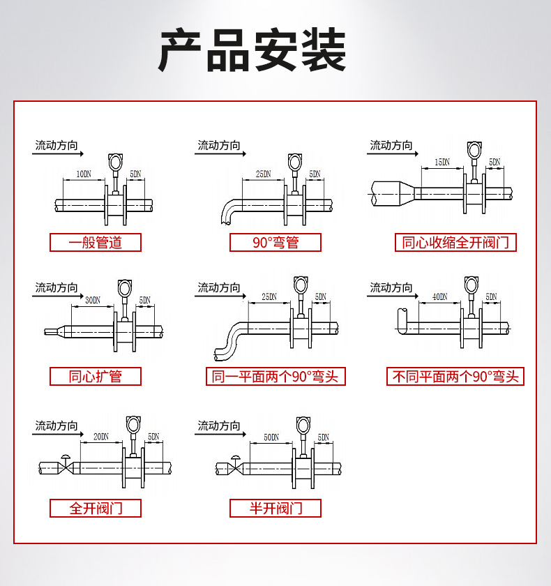 LUGB型涡街流量计根据选型不同可以实现以下功能:测量工业管道介质流体的温度、压力、瞬时流量和累计流量等参数,并具有脉冲输出、(4~20)mA模拟信号输出、RS485通讯(Modbus RTU协议)、物联网GPRS等功能。
